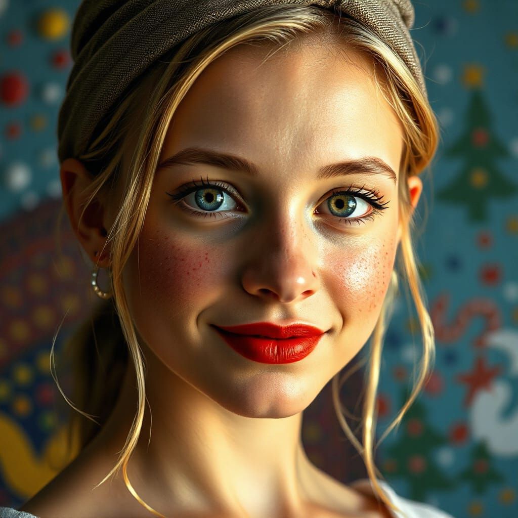 A vibrant image of a young blonde woman with freckles and a bright smile. This portrait features dramatic lighting and intricate details in a splash art style.