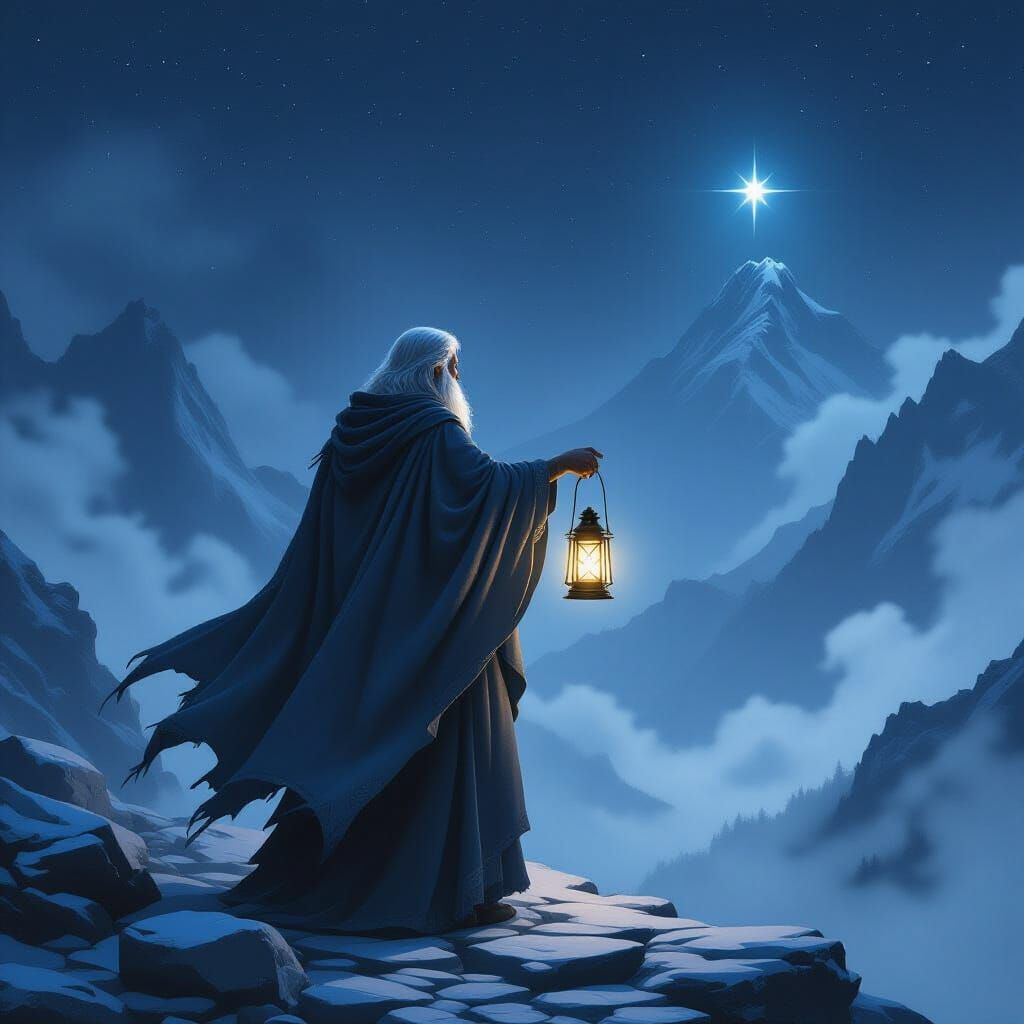 This atmospheric concept art shows a solitary elder on a mountain slope, holding a lantern with a guiding star. Dark fantasy style with ethereal lighting and deep blues.