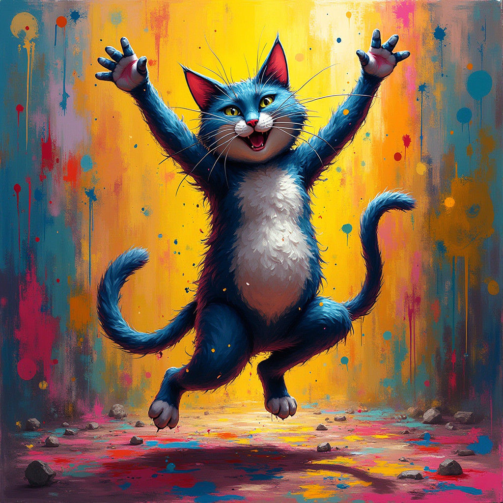 A vibrant image of a cat dancing amidst colorful graffiti patterns. The scene blends street art energy with fluid oil gouache techniques in a high-contrast, ultra-detailed digital art style.