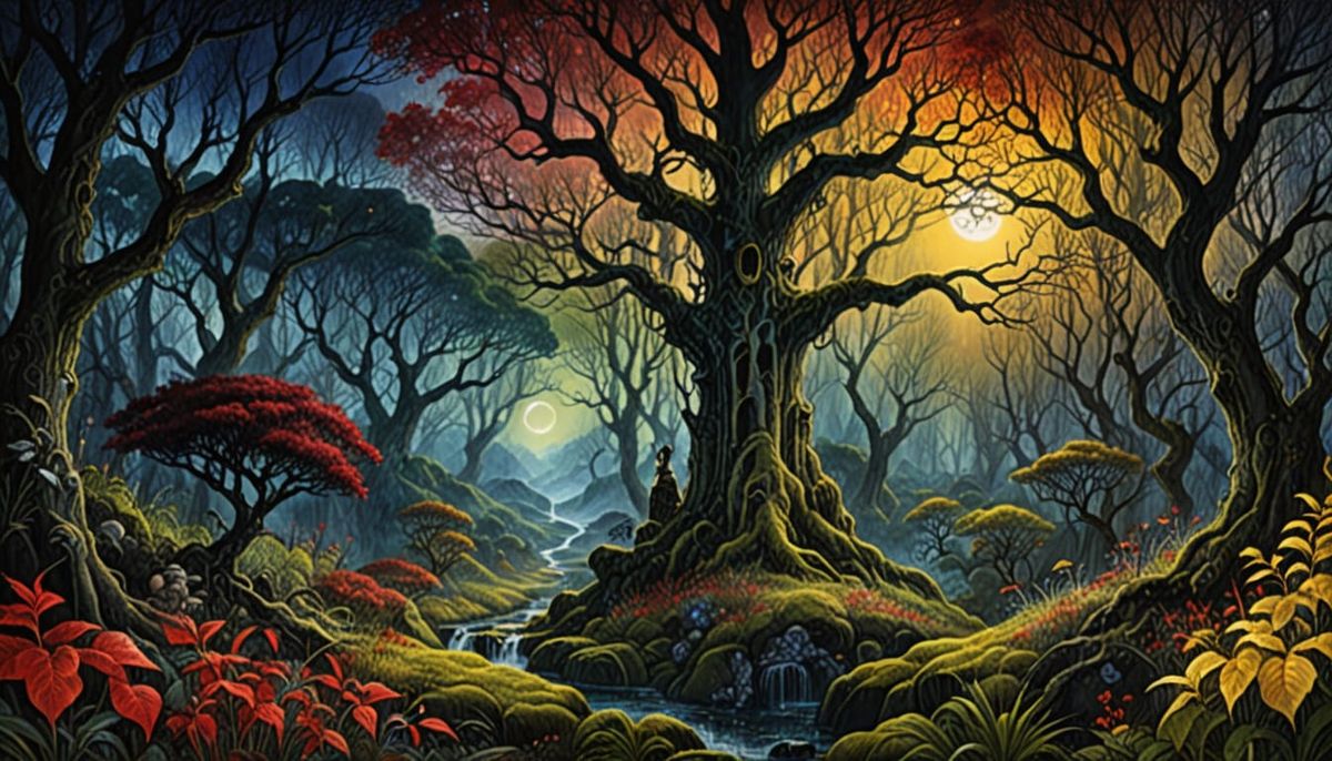 This image depicts a dark, misty forest garden illuminated by an aurora moonscape, with mysterious red and yellow eyes watching from the trees, rendered in a surreal digital art style.