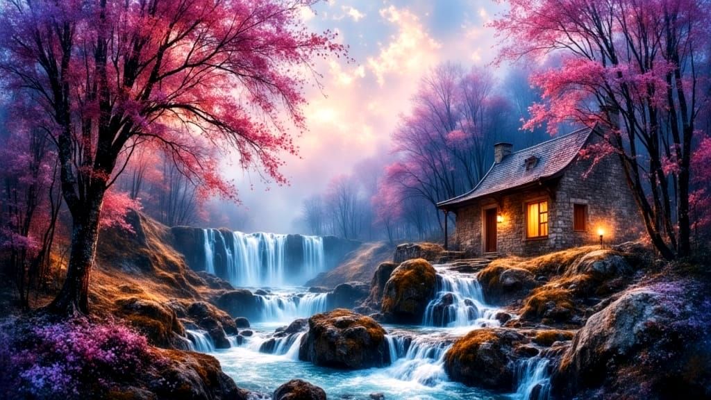 This image showcases a hyper-detailed oil painting of a stone cottage nestled in the mountains. Features a forest, waterfall, and stream, bathed in golden sunlight with romantic purple, blue, and pink hues.