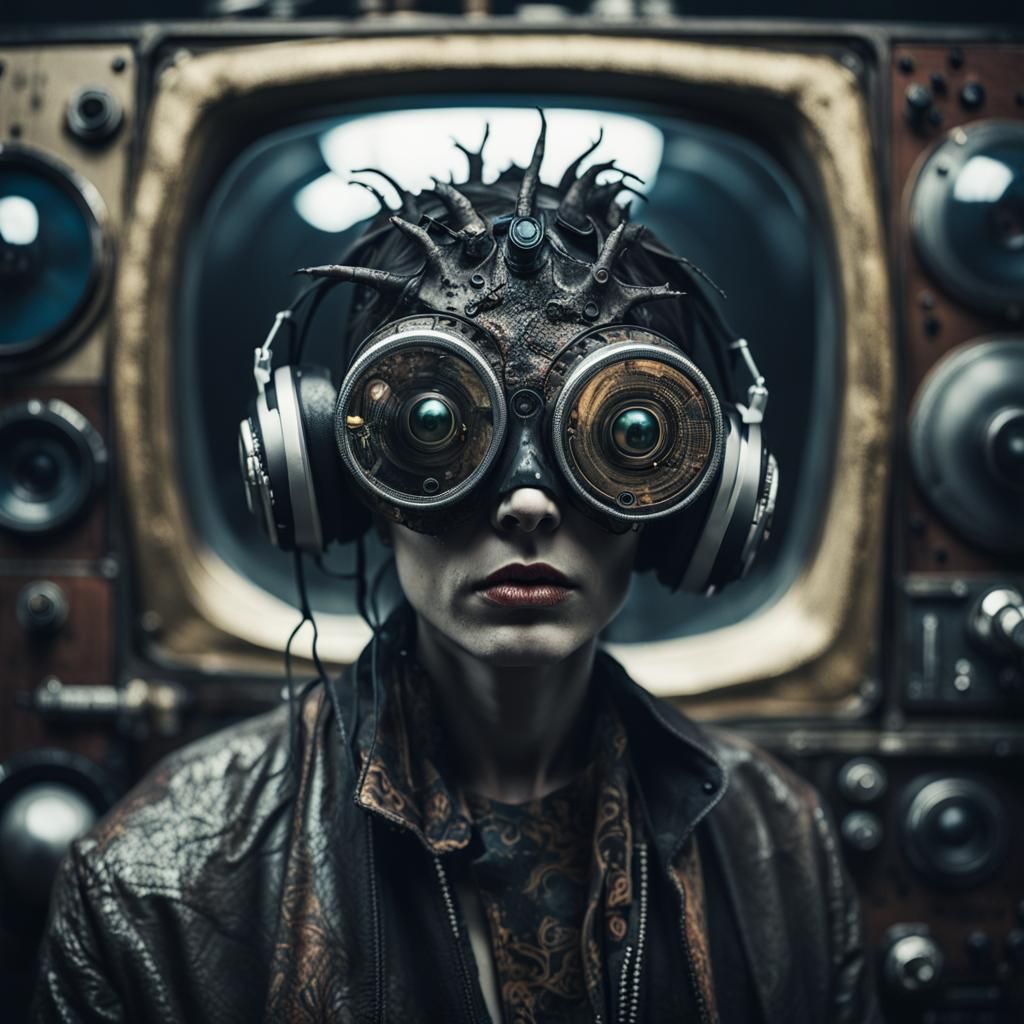 A cyberpunk model wearing VR goggles in a haunted house filled with technology and strange creatures. The close-up portrait captures the scene with ambient light and corroded details.