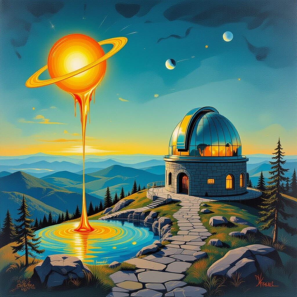 This image shows the Mont-Mégantic Observatory Center in a surreal style. The artwork is rendered as a melting oil painting, reminiscent of Salvador Dali's distinctive aesthetic.
