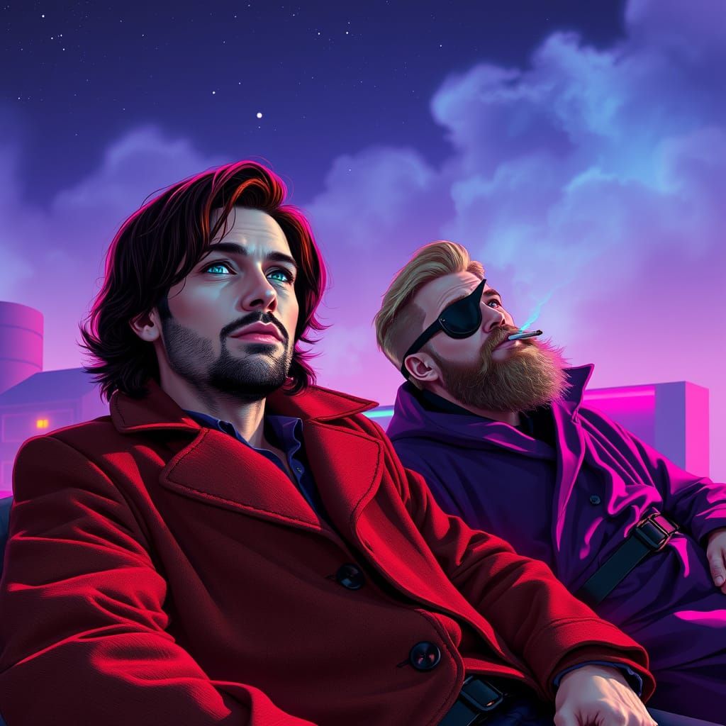 A vivid synthwave image of two men on a rooftop at night. One man sports heterochromia and a duster, while his friend wears an eyepatch and robe, set against a misty, neon-lit cityscape in an 80s retrofuturistic style.