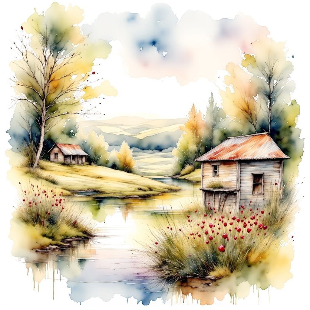 This image shows a rural scene depicted using ink and watercolor techniques. The artwork evokes a sense of nostalgia through its antique aesthetic.