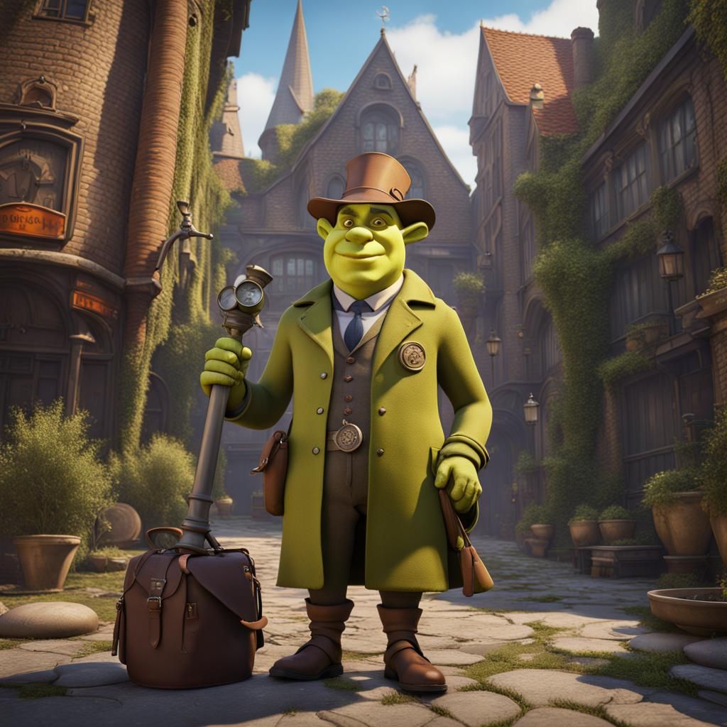 A detailed matte painting of Shrek in an Inspector Gadget costume. The image features deep colors, intricate details, and a fantasy concept art style in 8k resolution.
