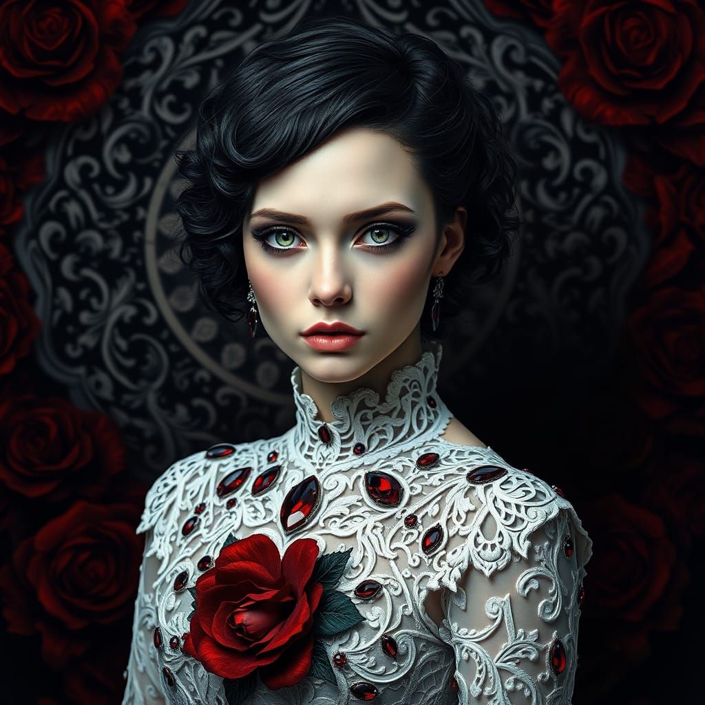 This image depicts a woman in a gothic-inspired lace gown with red gemstones, set against a dramatic background of deep red and black florals. Her piercing green eyes seem to wield dark magic, evoking an otherworldly intensity in a captivating, ethereal portrait.