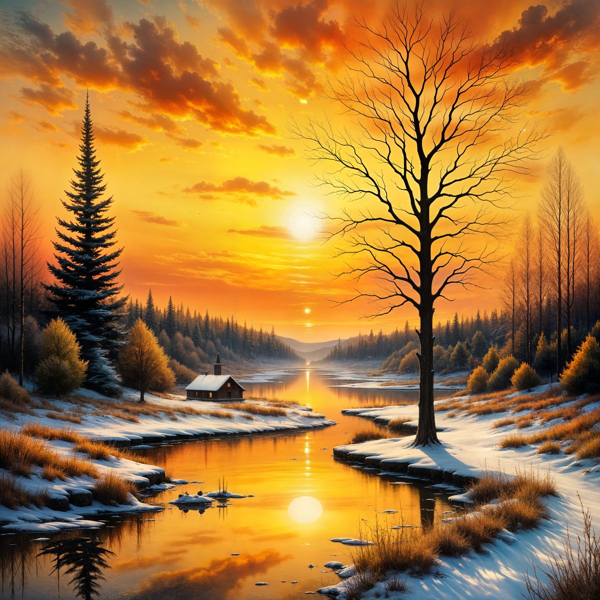 This image shows a breathtaking Impressionistic sunset landscape, featuring warm golden hues reflecting on tranquil water. A lone tree stands silhouetted against a vibrant sky, with snow in the foreground.