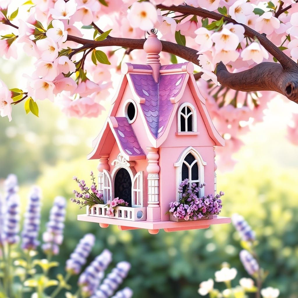 A watercolor-style image of a pink, miniature castle birdhouse hanging from a cherry tree. The birdhouse is surrounded by lavender and set in a sun-dappled garden.