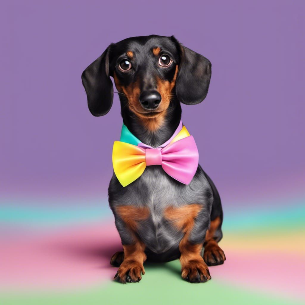A vibrant image of a black dachshund with hazel green eyes, wearing a pastel bowtie collar. This artwork, reminiscent of a candy dreamworld, features a whimsical and playful style.