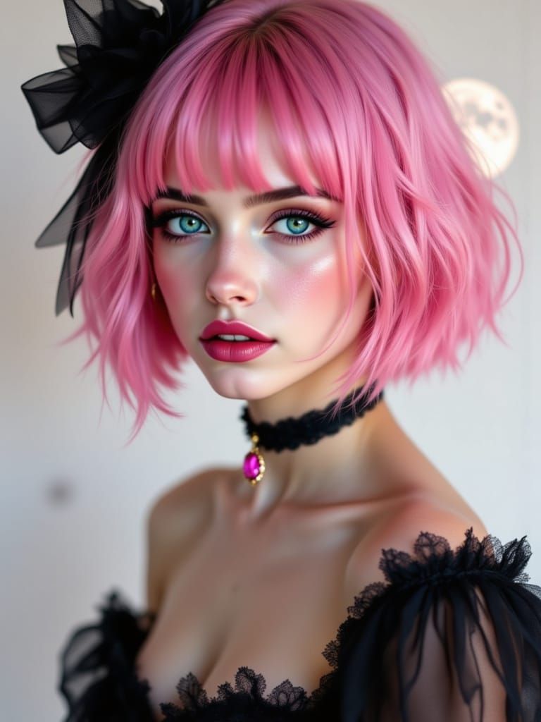 This image showcases a striking young woman with heterochromatic eyes and a vibrant pink bob, set against a soft gradient backdrop with a full moon. Her Victorian-inspired outfit and porcelain-like skin are highlighted by the warm, diffused lighting, emphasizing her bold features and intricate details.