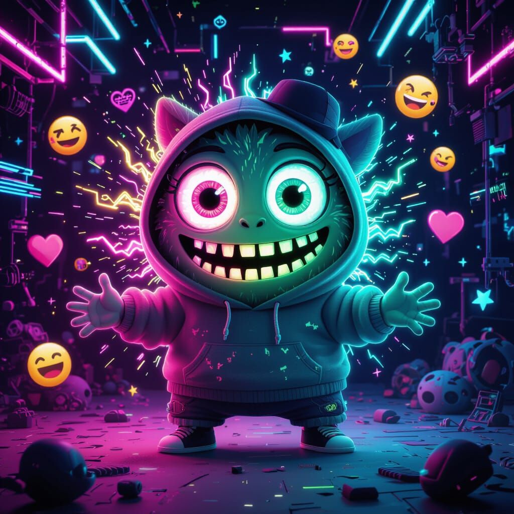This image features a small, rounded cartoon creature with googly eyes and a quirky smile, radiating chaotic energy. It's depicted in a vibrant, absurdist brainrot meme art style with neon colors and glitch elements.