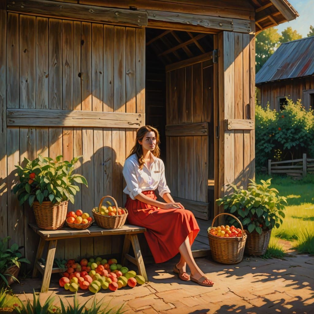 This image shows a young girl in a red skirt sitting on a porch. The impressionistic scene features a fruit basket, a wooden barn door, and warm, sunny light with soft brushstrokes.