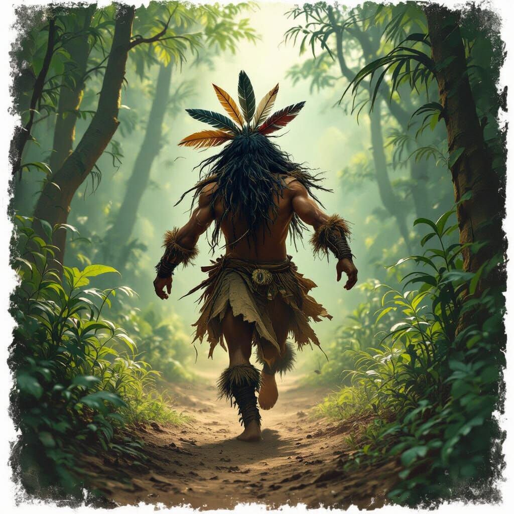 This image shows the Curupira, a mythological being, running backwards through a jungle. Clad in foliage and feathers, the scene features natural lighting, deep shadows and realistic textures, in a photorealistic style.