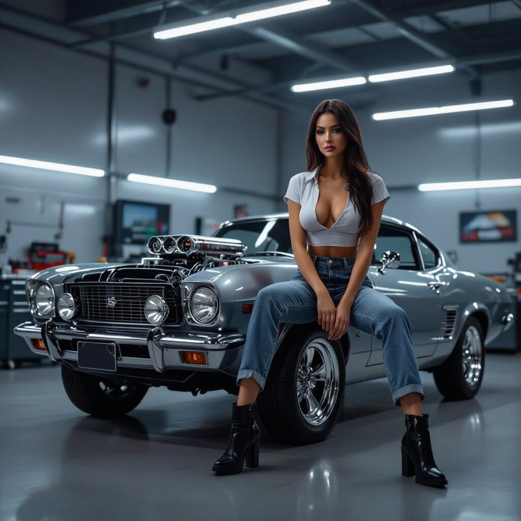 This photorealistic image captures a striking model posing seductively on a gleaming V8 engine in a chic, modern auto service garage. Dramatic lighting highlights metallic details and a bold luxury mood.
