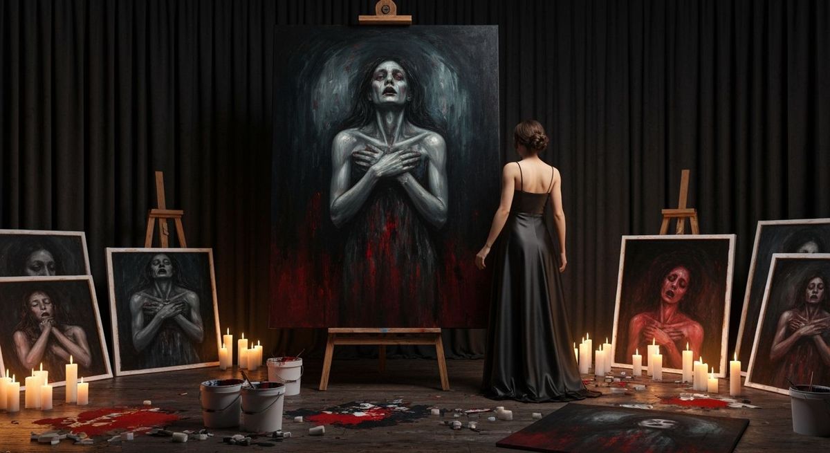 A hyperrealistic image of a female artist in a gothic black dress standing before a painting that depicts inner turmoil using a dark red and black color palette. The scene is lit by candles and evokes a mystical, eerie atmosphere.
