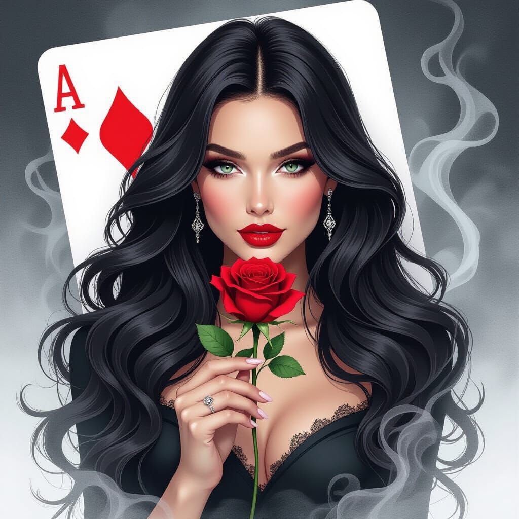 This image shows a woman with flowing hair and an expressive face emerging from a Queen of Hearts card. She holds a red rose, set against a smoky backdrop, in a dramatic monochrome sketch.