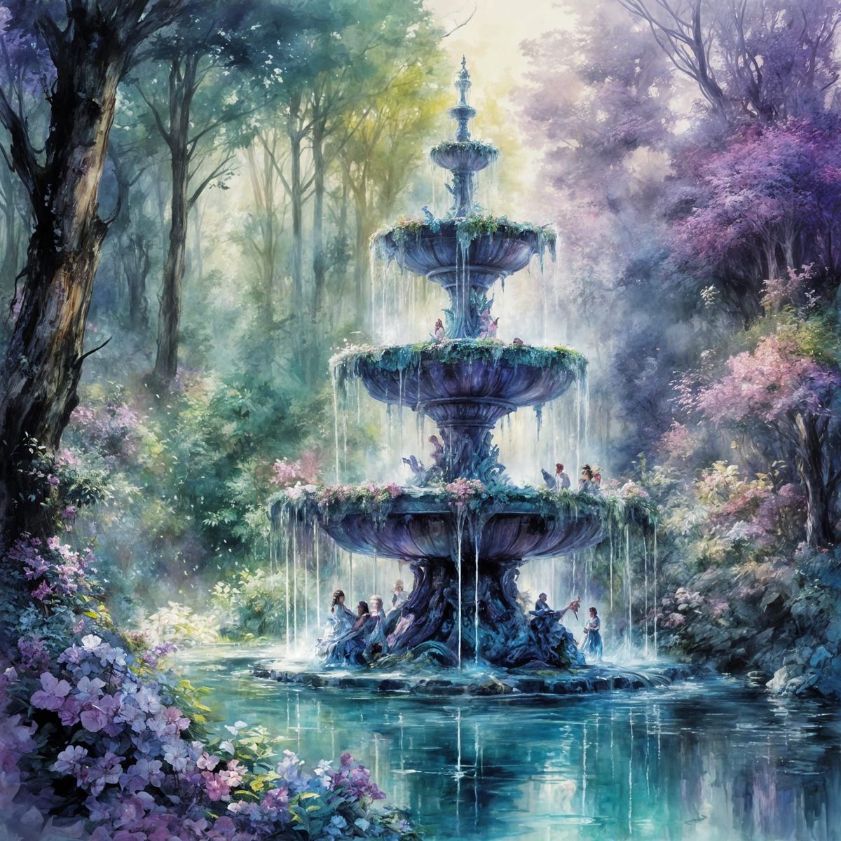 A vibrant image of an ornate fountain nestled in an enchanted forest. The colors are vivid and the scene rendered with intricate details. This piece evokes a romantic watercolor aesthetic.