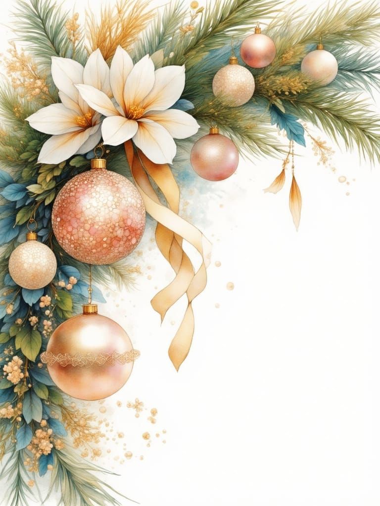 This digital matte painting showcases a Christmas border featuring pine swag, soft pink baubles with diamond patterns, white magnolias, and a champagne gold ribbon bow on a white background.