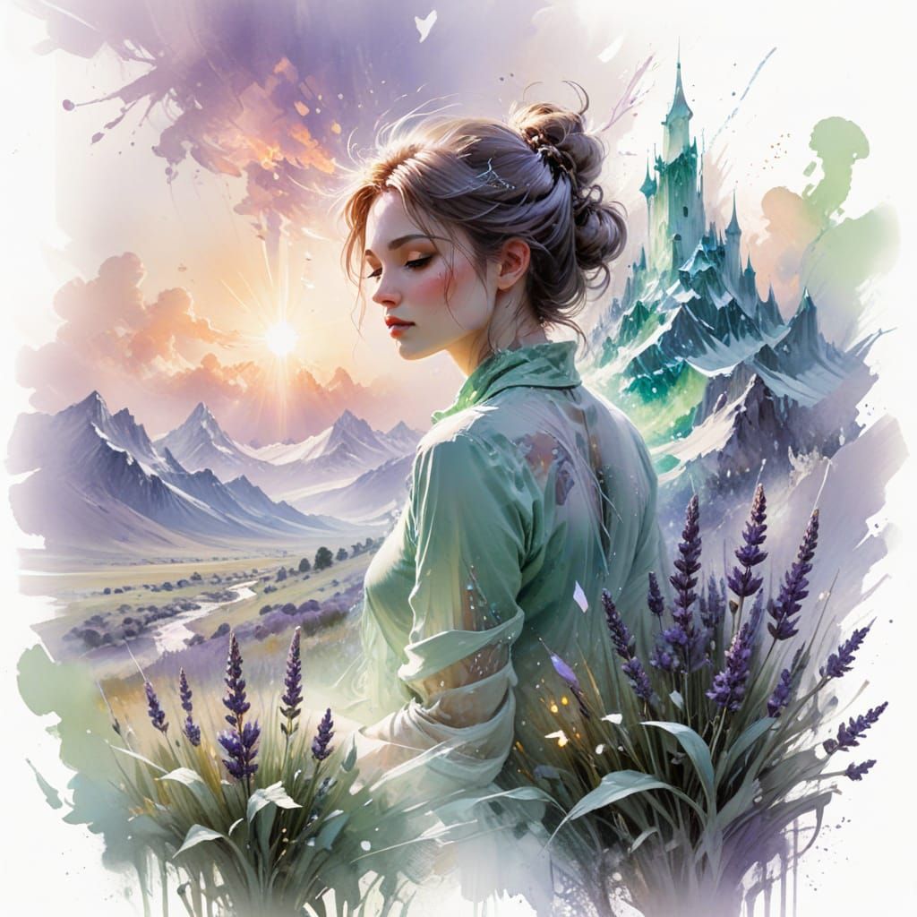 This image depicts towering quartz spires in a valley with jade rivers under a lavender sky. Auroras dance overhead, rendered in a painterly realism oil painting style with soft brushwork and warm, diffused backlight.