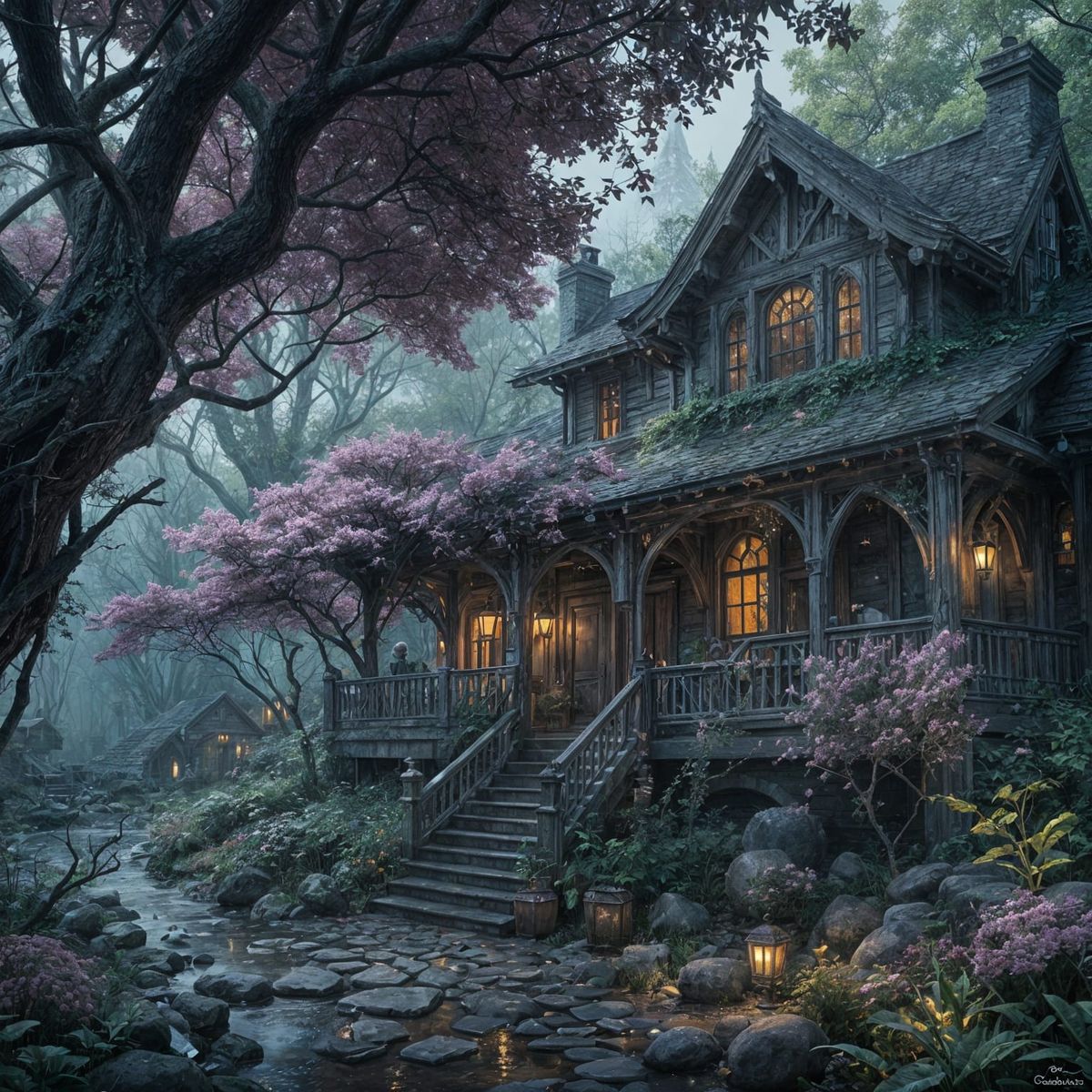 A grand, ethereal cottage, seemingly woven from moonlight and stardust, sits nestled within a fantastical forest. The surrounding trees are ancient and gnarled, their branches dripping with a magical sparkle. Strange, luminescent birds flit through the air, adding to the dreamlike enchantment. The art ...