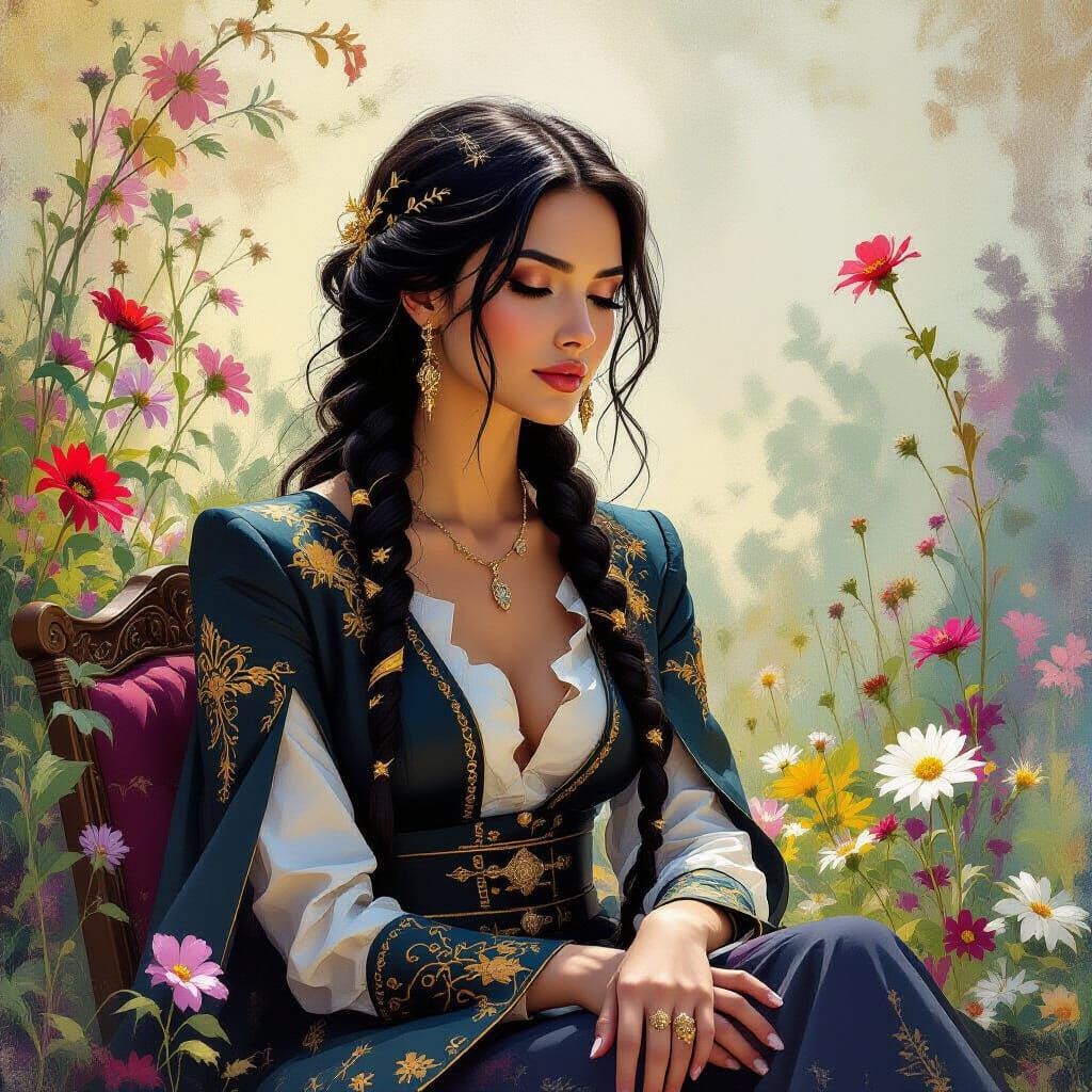 A digital portrait of a woman with black hair braided with gold threads, wearing an elegant suit. She sits serenely in an abstract garden in a surreal digital art style.