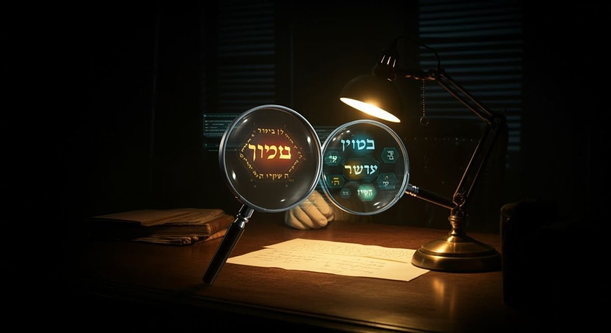 A black and white film noir illustration of a futuristic AI detective. The scene features floating magnifying glasses and holographic tools, with selective color highlights.