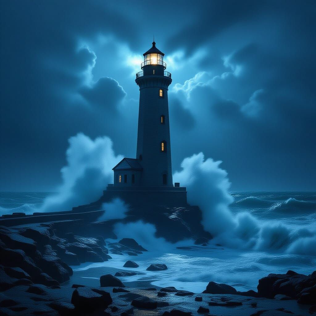 This image shows a solitary lighthouse battling a ferocious storm. The scene is rendered with dark, realistic art, creating a creepy and unsettling atmosphere with dramatic CGI effects.