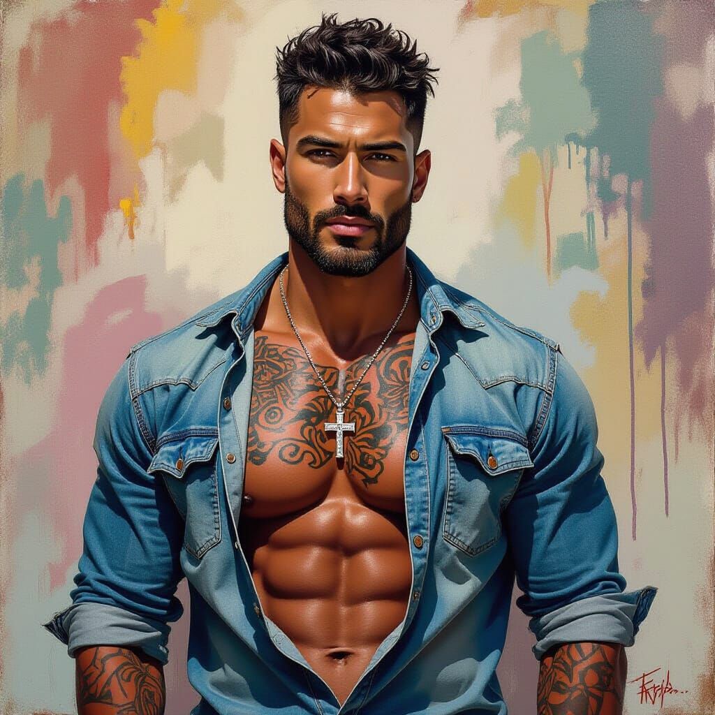 A striking picture of a muscular man with tattoos and a silver cross necklace. The background is a vibrant watercolour painting, reminiscent of mixed media and portraiture styles.