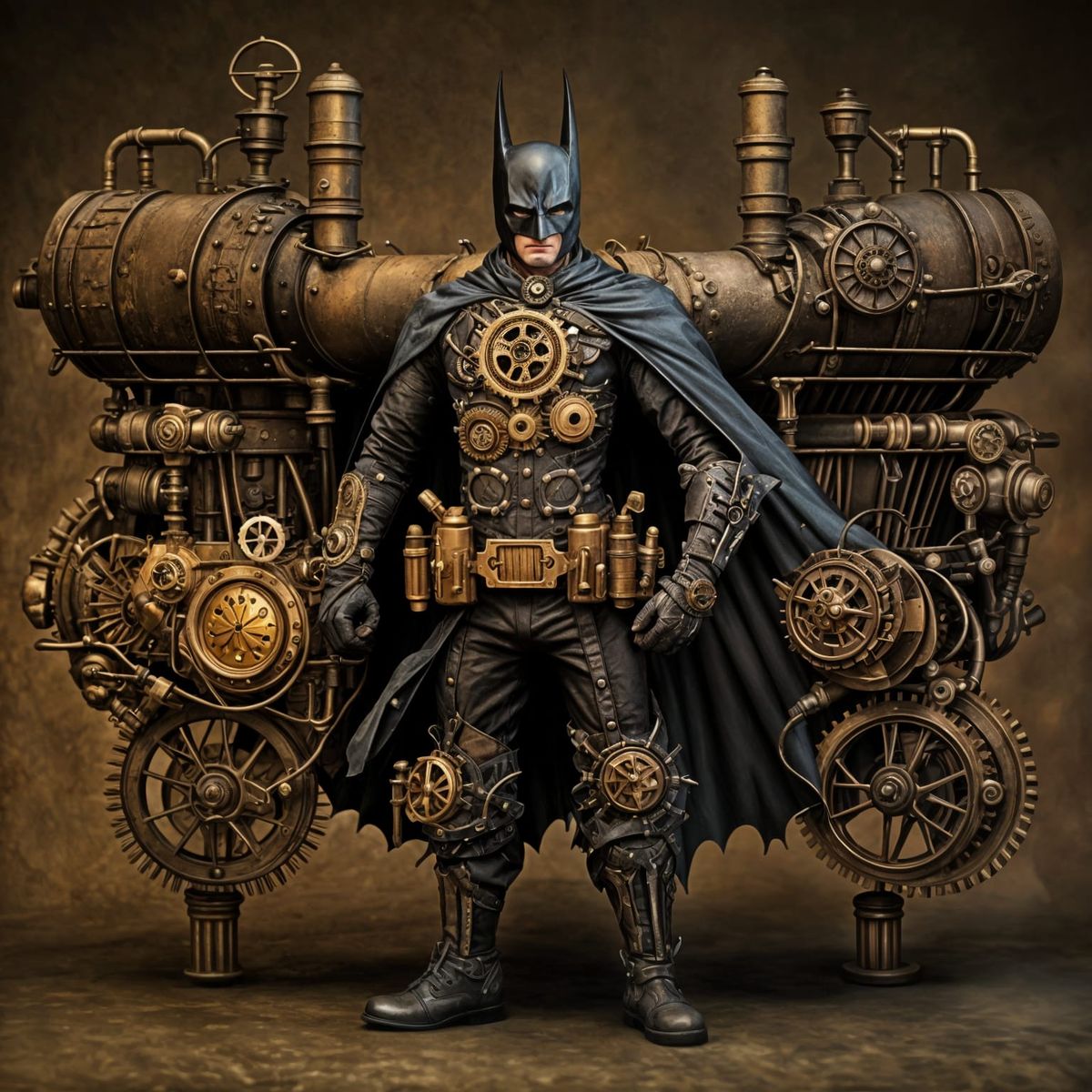 This image shows a steampunk-style Batman. The character is set against a backdrop of intricate clockwork mechanisms and Victorian-era technology, rendered in a steampunk aesthetic.
