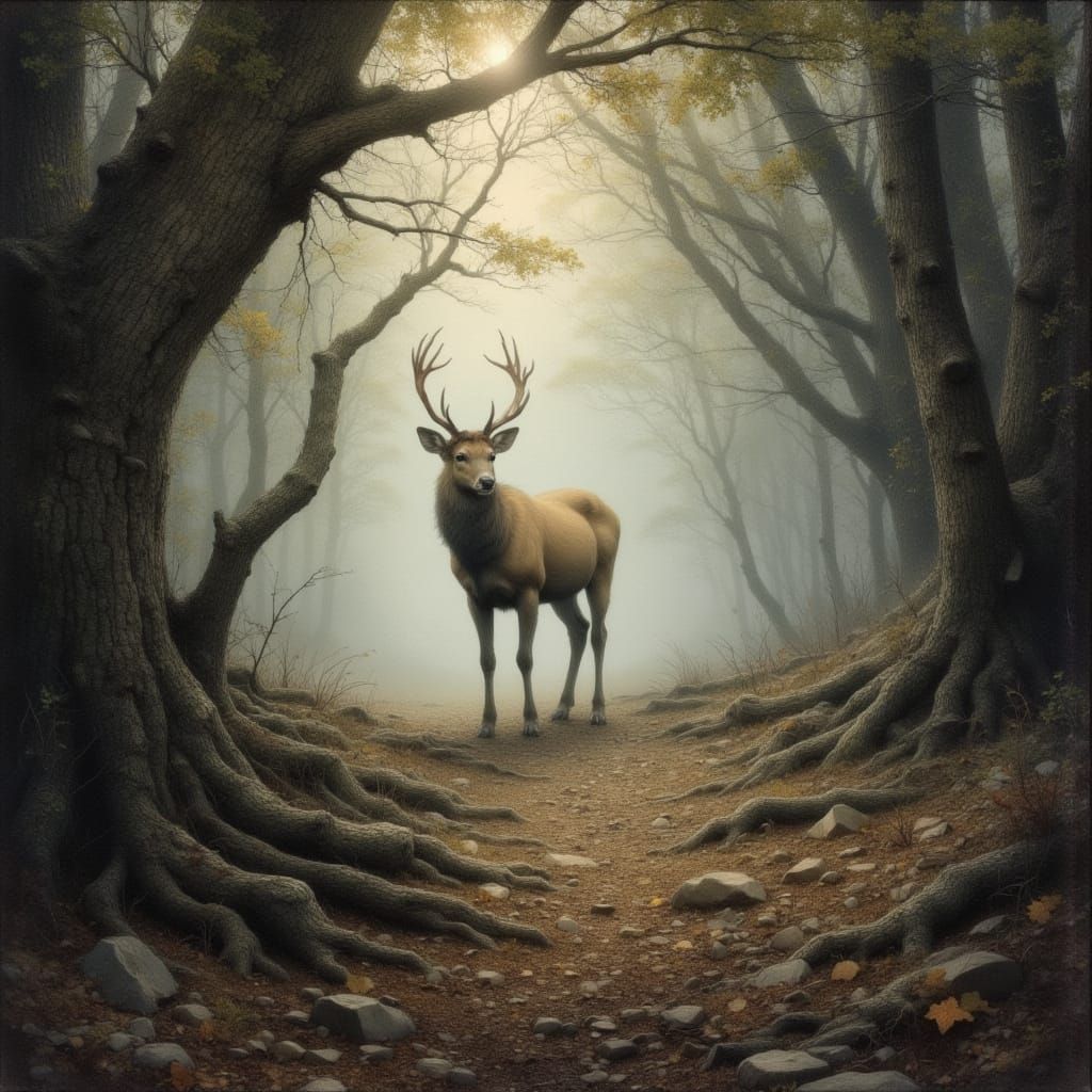 A majestic stag stands serenely in a misty, ancient forest grove. Sunlight struggles to penetrate the thick fog, casting ethereal rays upon the damp earth and gnarled roots. The deer is perfectly still, its breath misting in the cool air. The scene evokes a sense of profound solitude and timelessness. ...