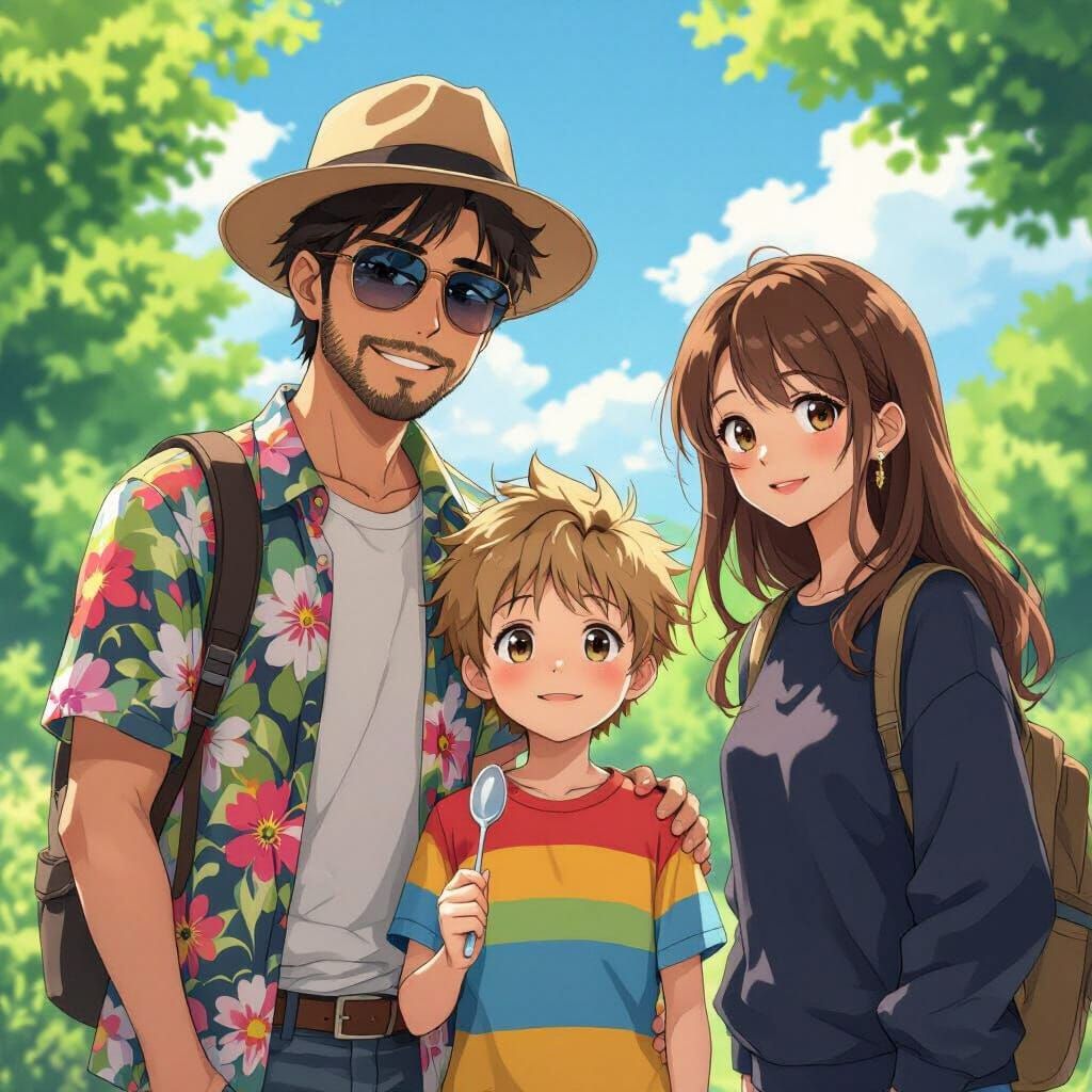 This image shows a family of three enjoying a sunny day. The scene is rendered in a vibrant anime style, with a warm and loving atmosphere reminiscent of beloved animated films.