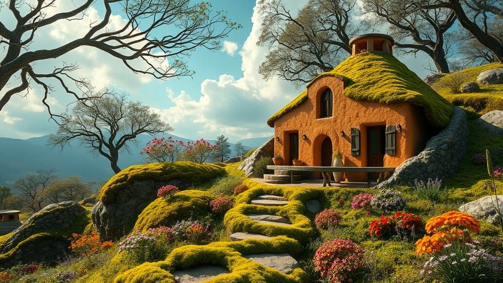 A vibrant image of a dwelling nestled in an alien landscape. The adobe house is surrounded by moss and colorful flowers, creating a surreal, nature-inspired scene.