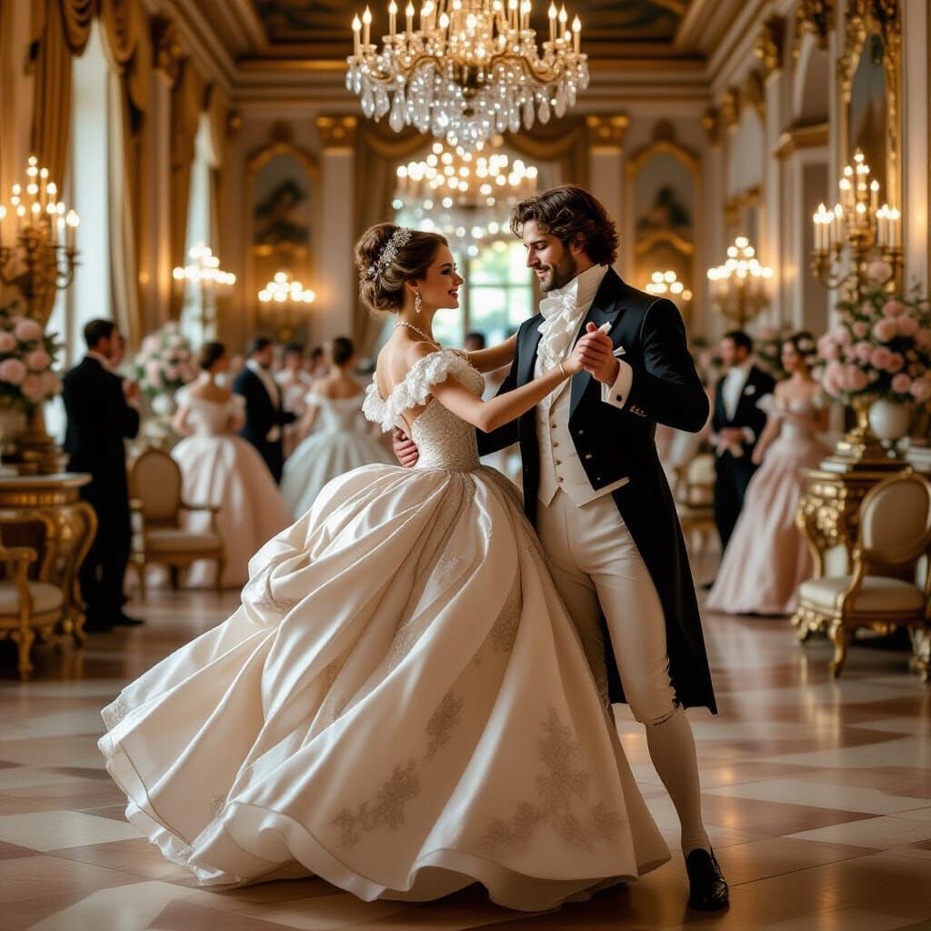 This image depicts a romantic Rococo ballroom scene with a lady in a silk gown dancing with a gentleman. It features ornate decor and soft lighting, rendered in a delicate pastel palette.