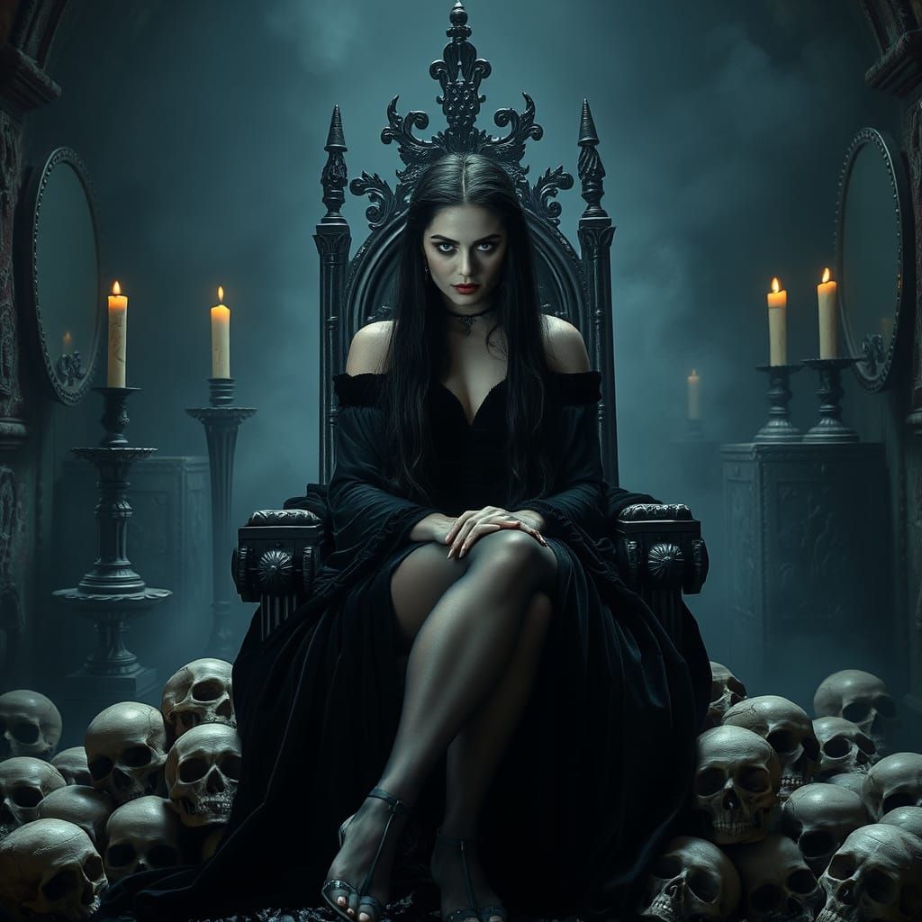 A mysterious vampire queen sits on a throne of skulls in a dimly lit crypt, surrounded by surreal objects and an atmosphere of dark fantasy and feminine mystique, with cinematic lighting and intricate detail reminiscent of surrealist art
