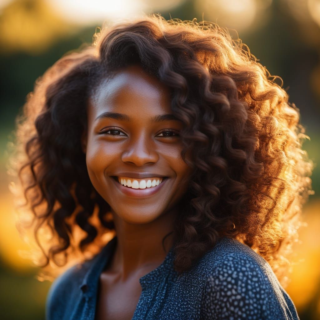 A vibrant portrait of a smiling woman with dark skin. The medium shot captures her head and shoulders, bathed in warm, golden light with soft focus and natural colors.