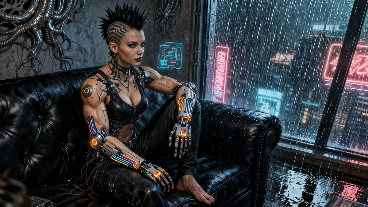 This image depicts a gothic woman with a tribal mohawk and muscular physique on a black leather couch. The scene is set in a rainy cyberpunk apartment, featuring biomechanical and futuristic elements.