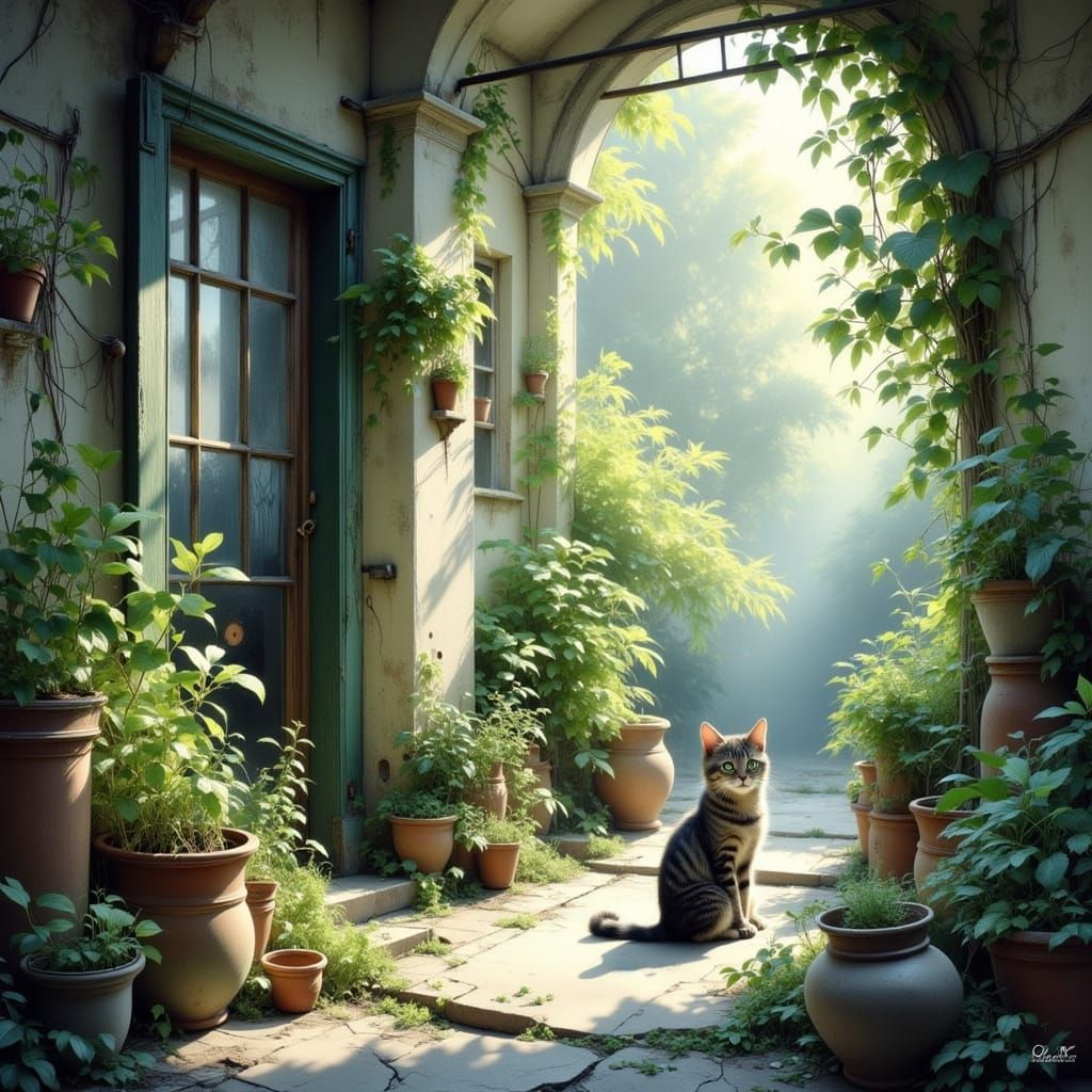A stray tabby cat with green eyes finds peace in an overgrown greenhouse, illuminated by a sunbeam. Painted in an Impressionist style with visible brushstrokes, capturing tranquil light and shadow.