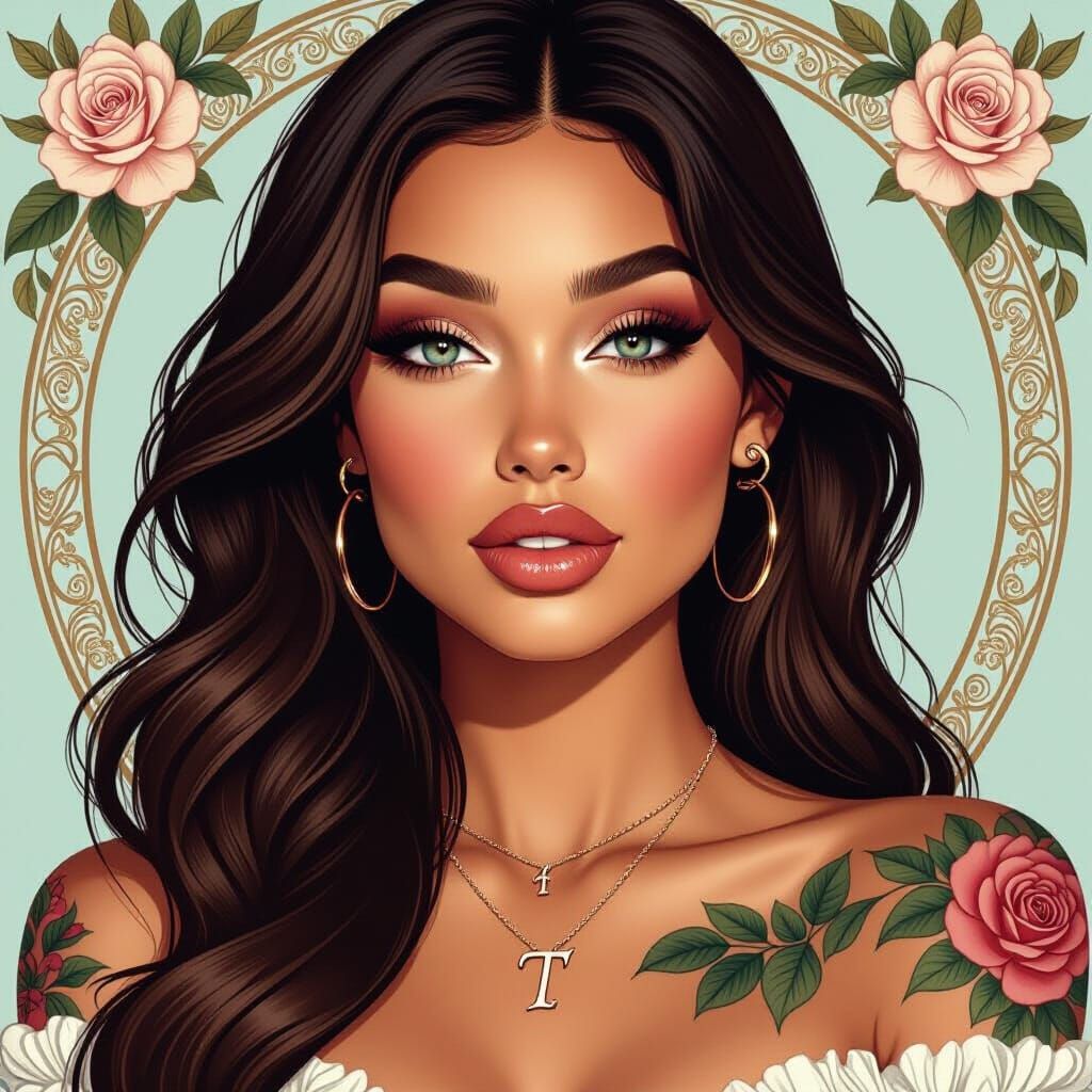 This image shows a beautiful woman with tanned skin, blue eyes, and long brown hair. She has rose tattoos on her arms and wears a rose gold necklace. The portrait features an art nouveau aesthetic.