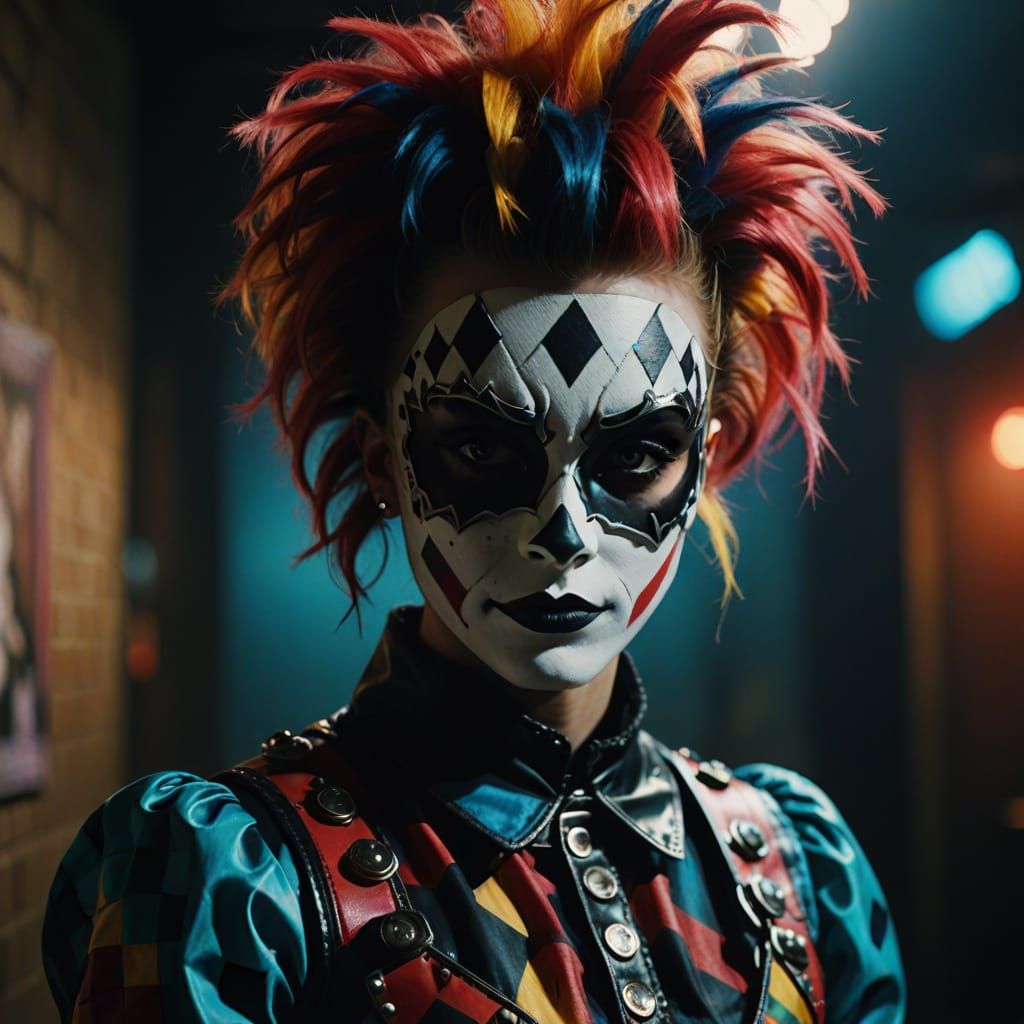 A hyperrealistic close-up cinematic shot of an English woman in a harlequin mask and punk-inspired costume. The image features vibrant colors, film grain, and dramatic, atmospheric lighting.