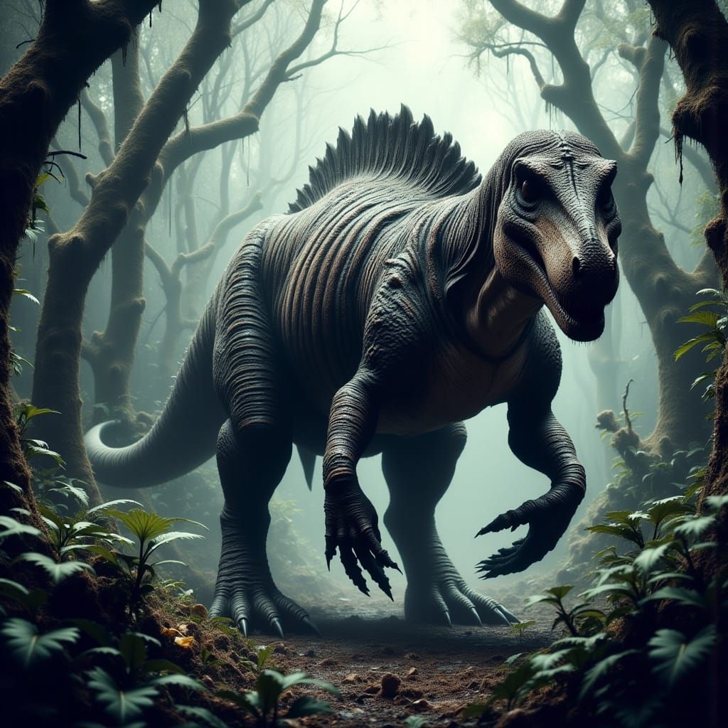 This prehistoric creature stands proudly in a lush jungle, its scaly body adorned with black tiger stripes, razor-sharp claws, and a unique tail. A mesmerizing blend of textures and dark colors creates an air of mystery and wonder.