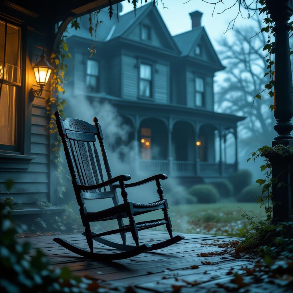 This image shows a vintage rocking chair moving on the porch of a spooky Victorian mansion, hinting at a ghostly presence. The scene is rendered as detailed matte painting, with warm light leaks and vintage color tones.