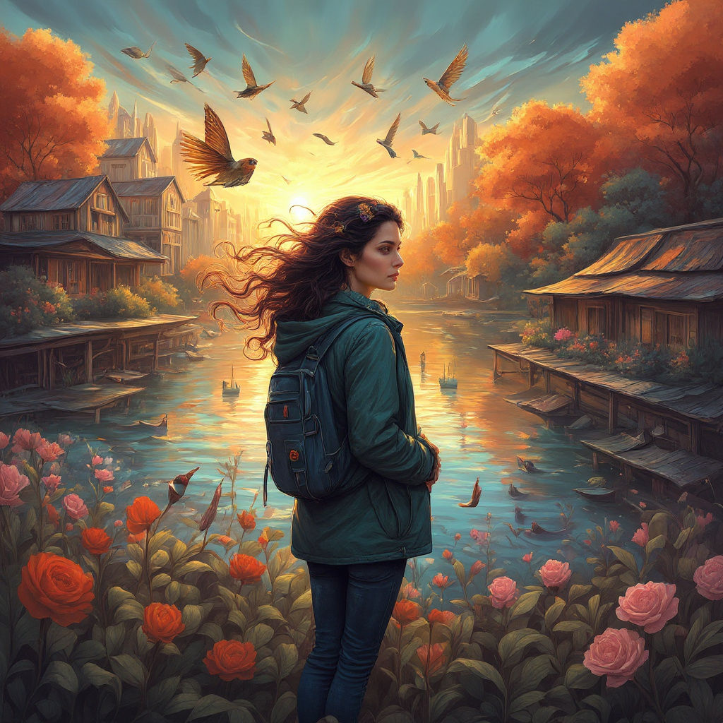 This image shows a woman with windswept hair by a lake at dusk. Deer and rabbits graze nearby amidst colorful flowers, bathed in golden sunlight. The scene is a digital matte painting.