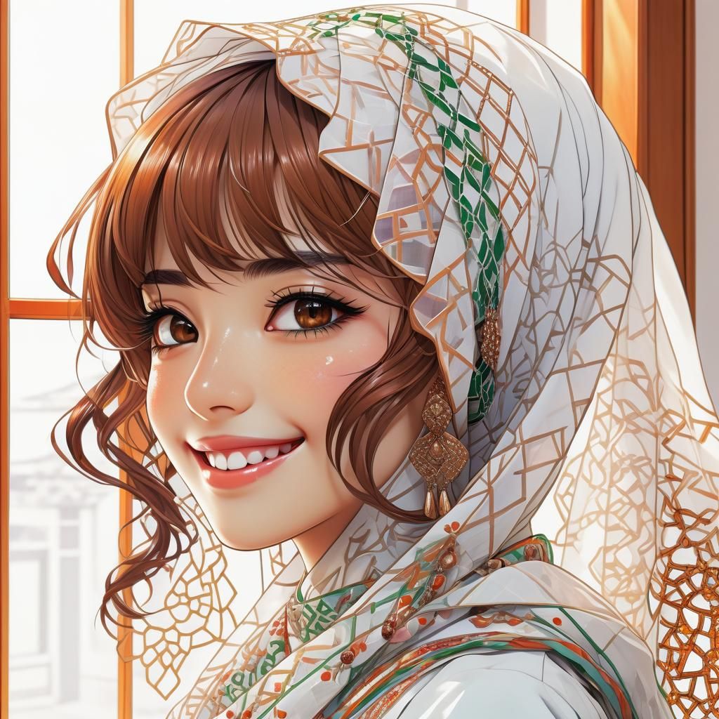 A close-up anime-style portrait of a smiling, veiled Algerian girl. The vibrant digital artwork features bold lines, clashing colors, and soft gradients reminiscent of manga art.