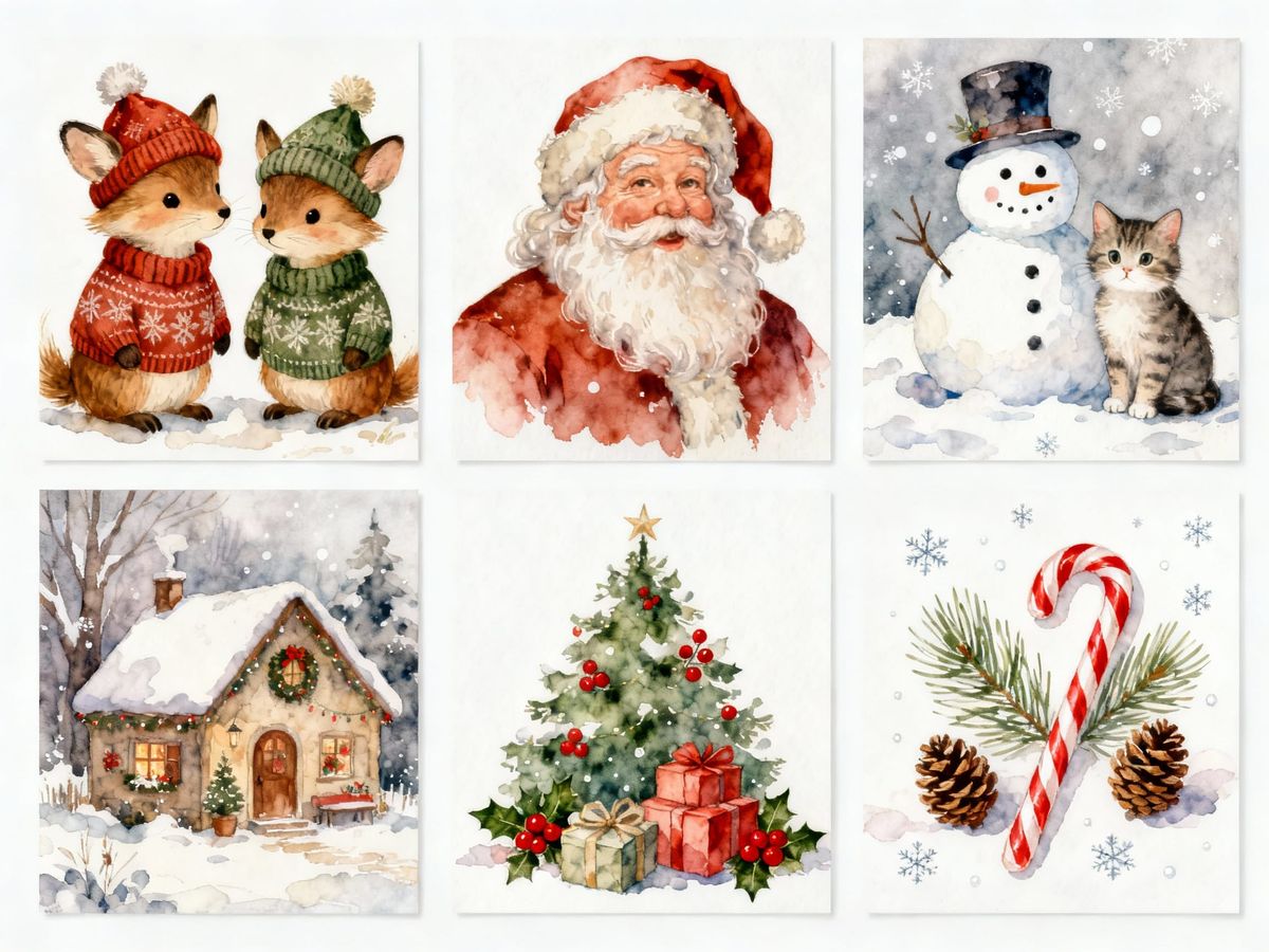 This image showcases a collection of intricately detailed, vintage-style Christmas cards. Each card features charming scenes like woodland animals, Santa, and snowmen, rendered in a soft watercolor aesthetic.