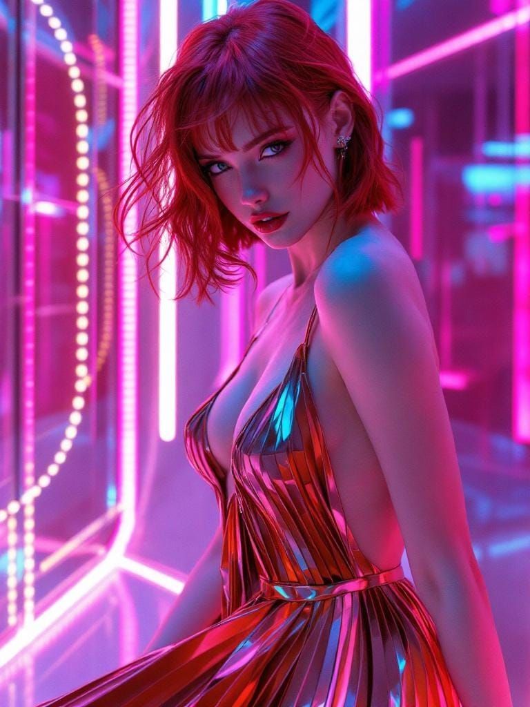 A striking picture of a red-haired woman in a bronze metallic dress. The artwork blends chrome futurism with soft character expression and a vaporwave aesthetic to create an elegant, electrified scene.