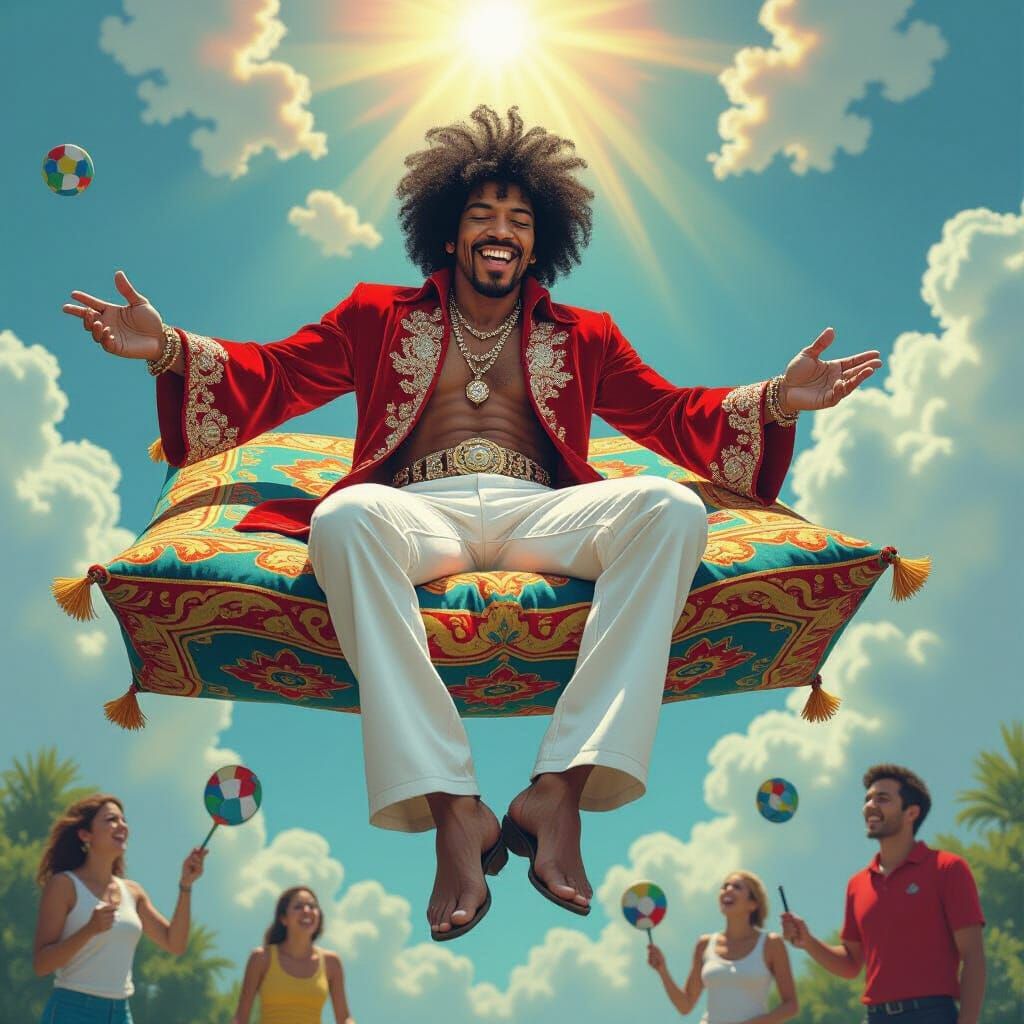 A vibrant image of a man riding a magic carpet above pickleball players. The psychedelic scene features dreamy, surreal colors, reminiscent of digital art.