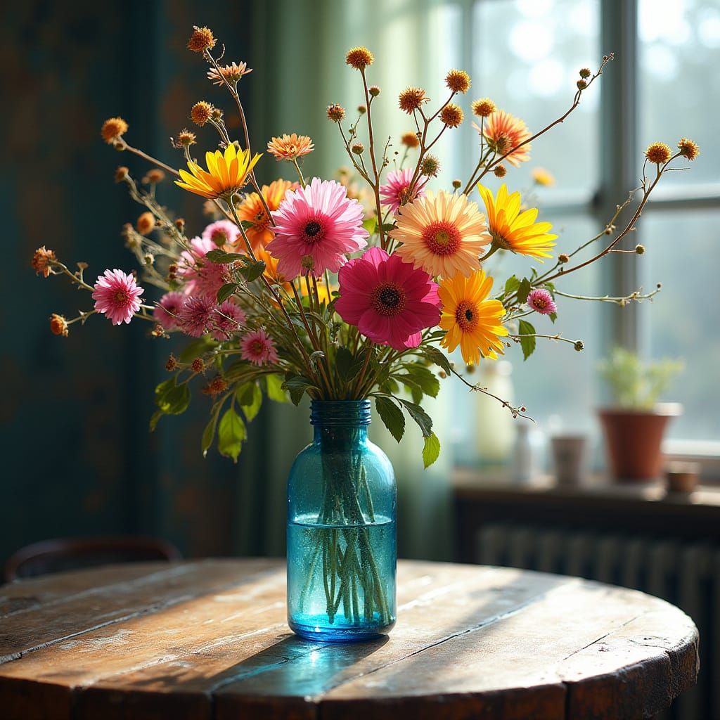 A still life image shows wildflowers in a blue glass bottle on a wooden table, bathed in soft light. This photorealistic artwork features watercolor and ink textures with dynamic lighting.