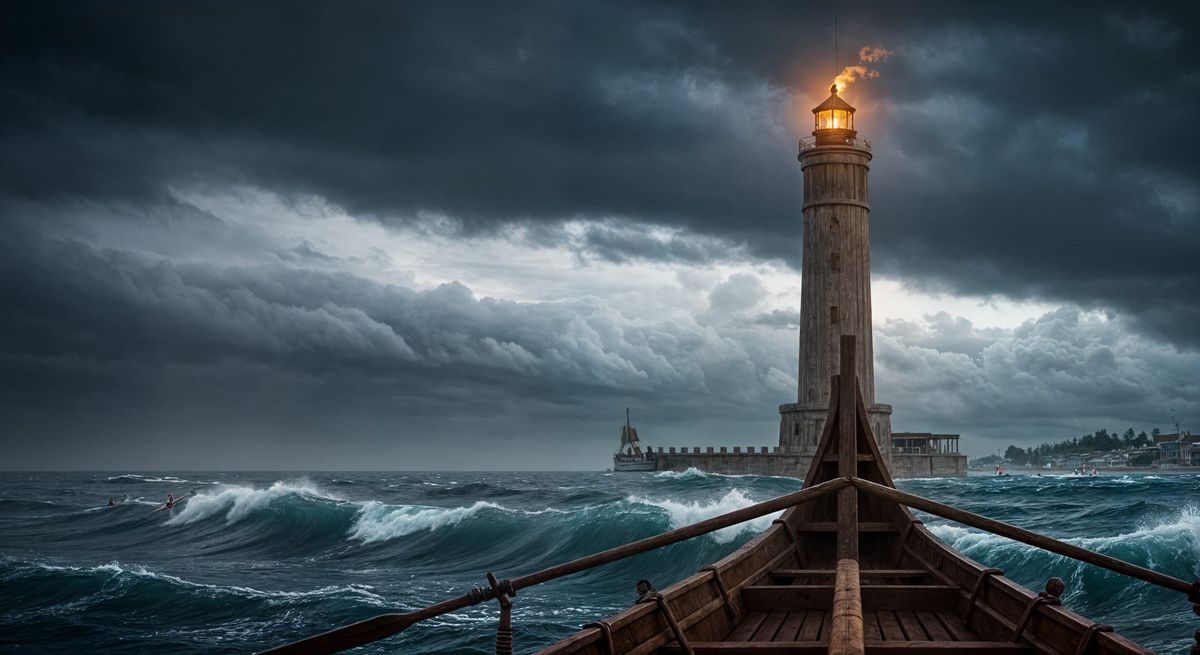 This image shows the Pharos of Alexandria at dusk, viewed from a Roman galley. The lighthouse beacon is lit against a dramatic sky and a turbulent sea.
