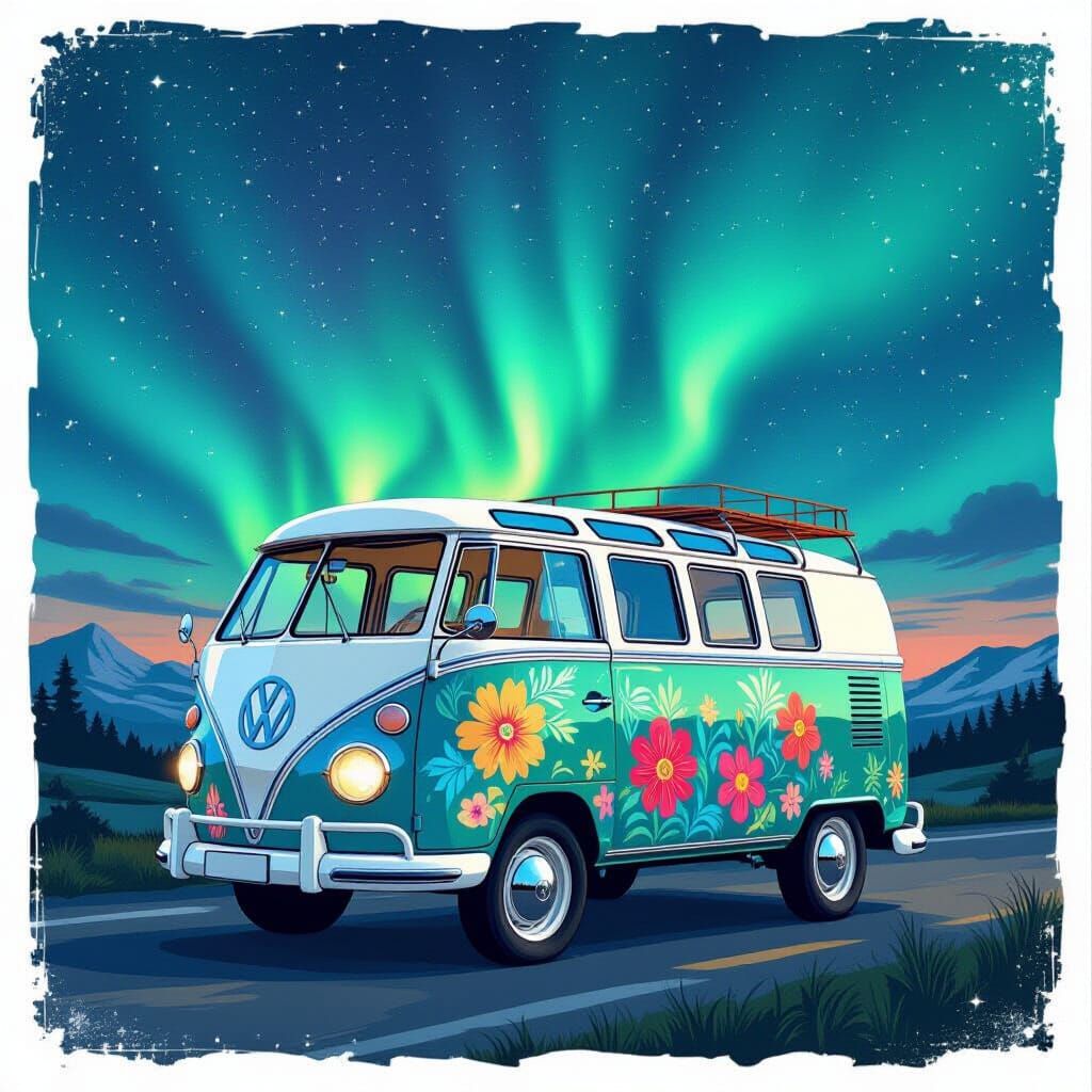 This image features a vintage VW camper van adorned with floral patterns and metallic accents, set against a vibrant aurora borealis. Designed for a T-shirt, it showcases intricate detail and a retro, whimsical style.